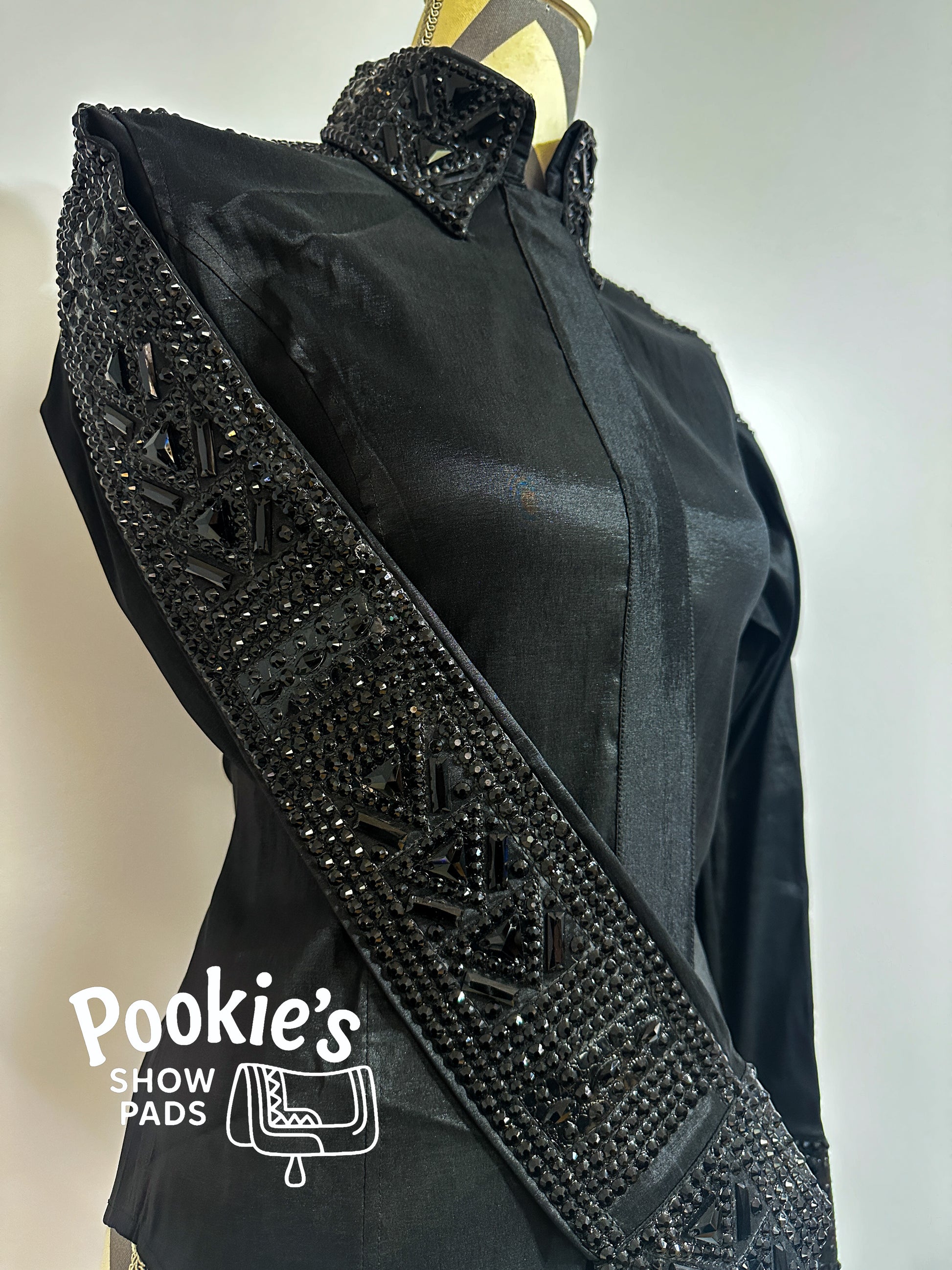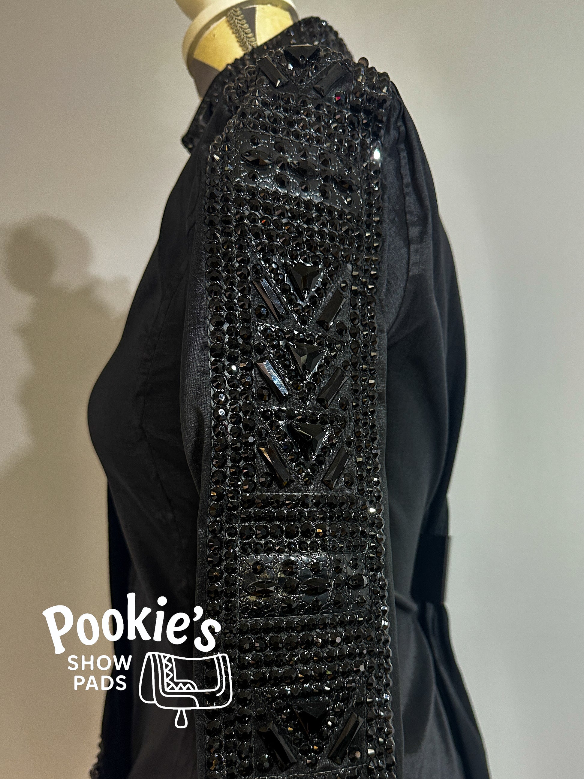 Black stretch taffeta base full sleeve day shirt with hand-glued and sewn black stones for a bold, refined look. Features a hidden zipper for a sleek fit and includes a padded garment bag for safe, stylish storage. Pairs perfectly with any pad ✨