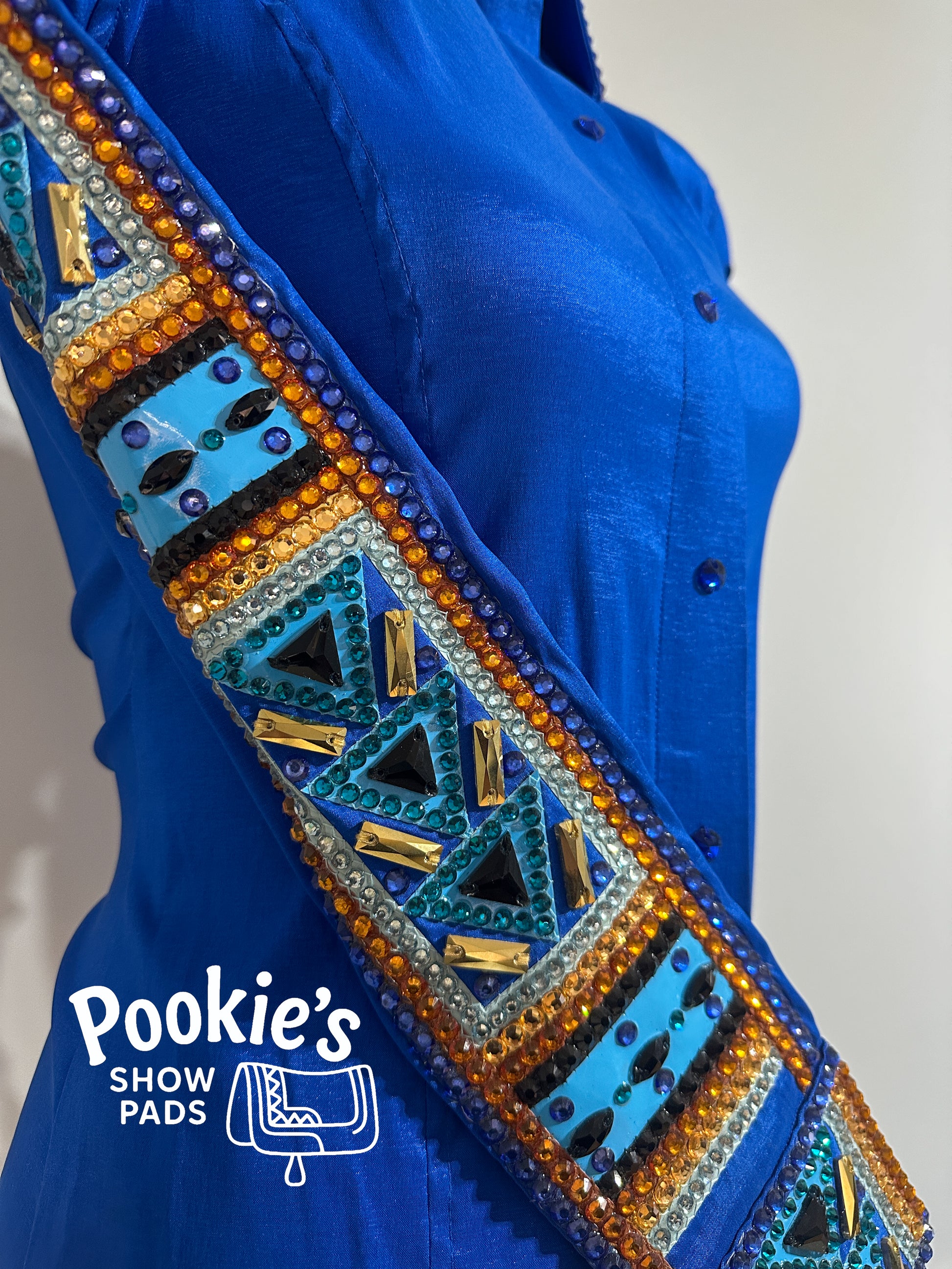 Royal blue stretch taffeta base full sleeve day shirt with hand-glued and sewn copper, tan black and light blue stones for a bold, refined look. Features a hidden zipper for a sleek fit and includes a padded garment bag for safe, stylish storage.