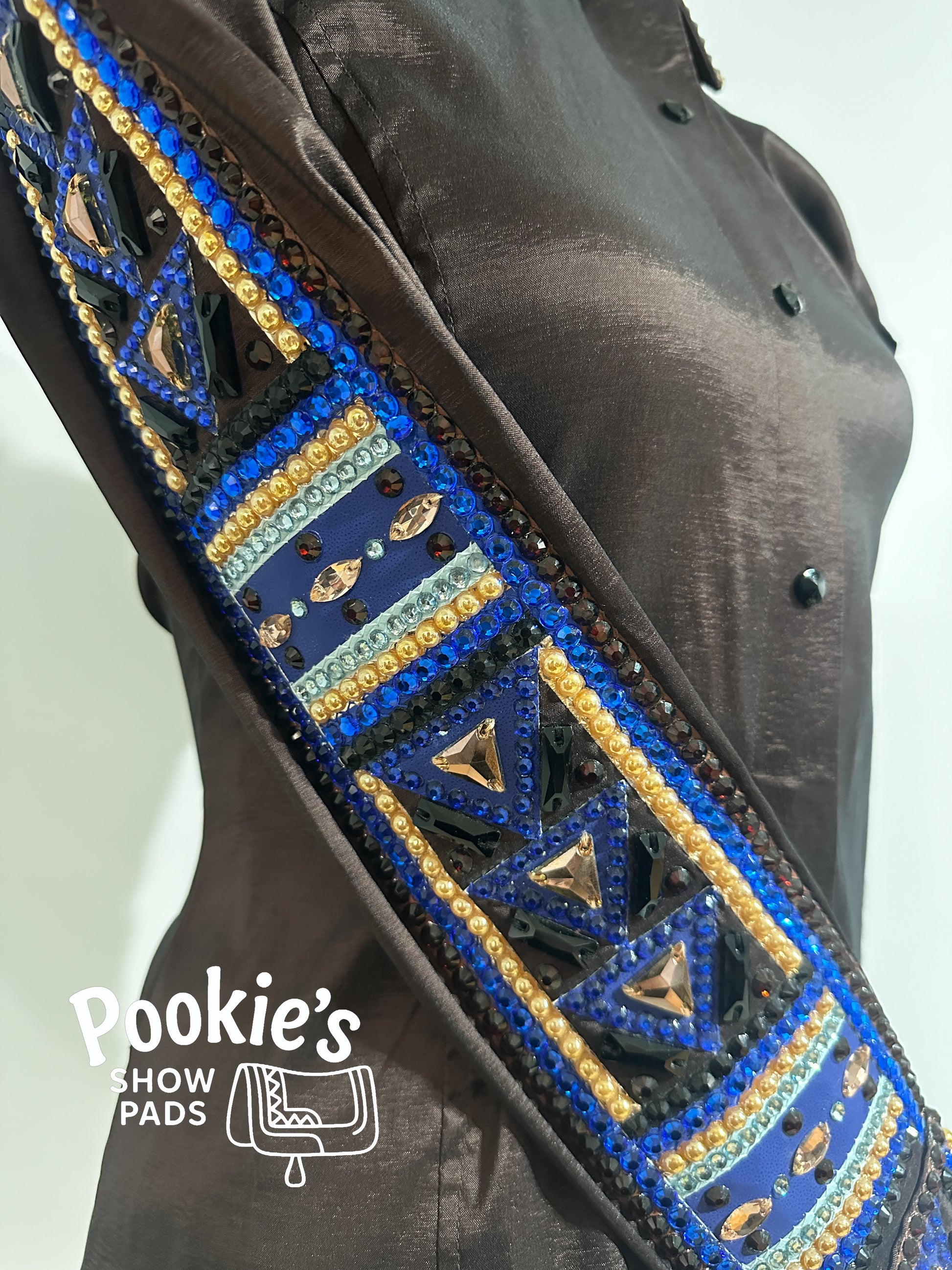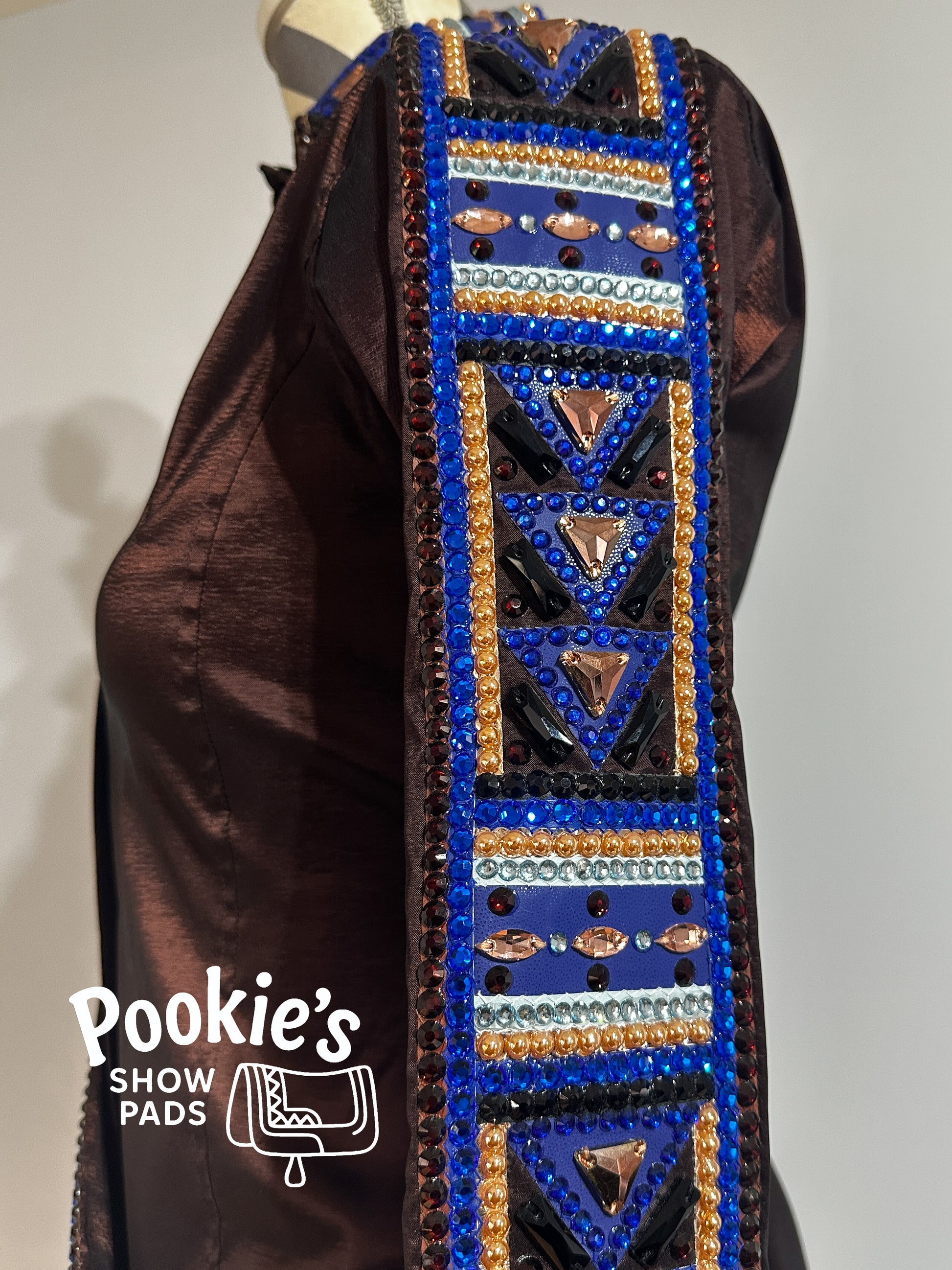 Rich chocolate stretch taffeta base full sleeve day shirt with hand-glued and sewn brown, royal blue, light blue, gold stones and pearls for a bold, refined look. Features a hidden zipper for a sleek fit and includes a padded garment bag for safe, stylish storage.