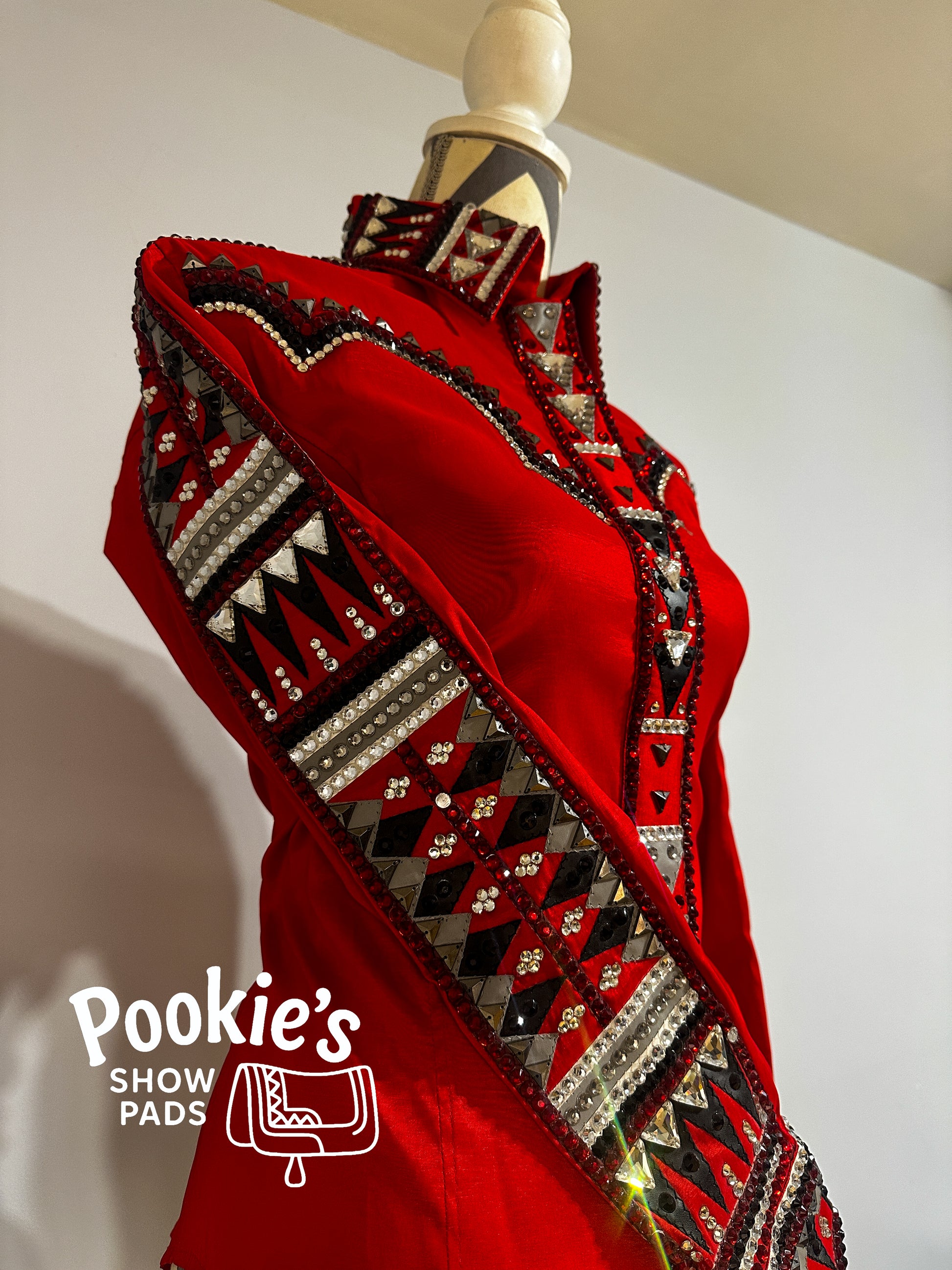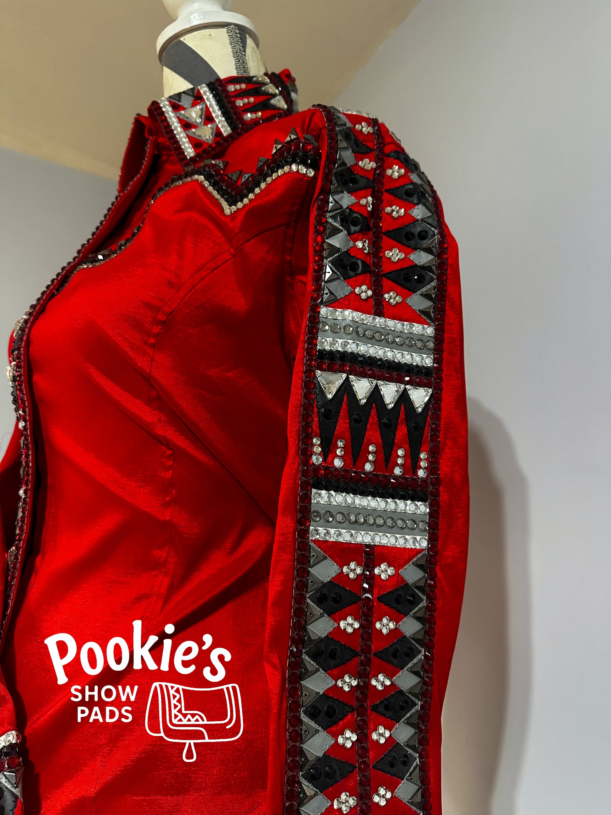 Bright red stretch taffeta base full sleeve day shirt with front yoke. Hand-glued and sewn clear, grey, black and red stones for a classic look. Features a hidden zipper for a sleek fit and includes a padded garment bag for safe, stylish storage.
